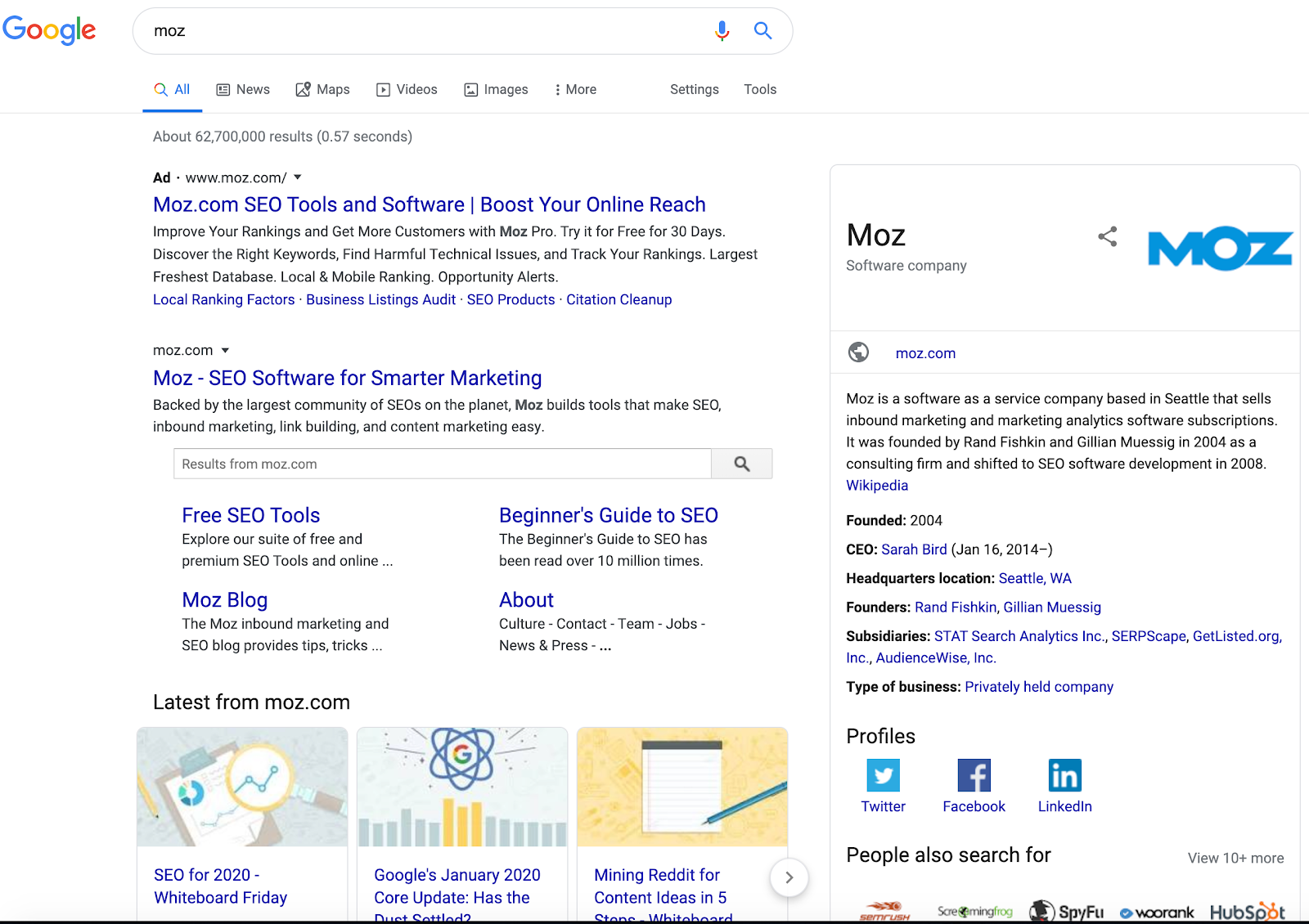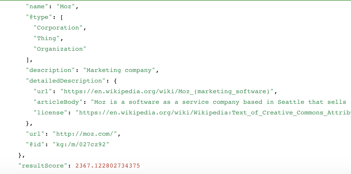 As you can see, Moz shows up in the knowledge panel because the company is an entity. If you search the Google Knowledge Graph API for the company name, you can see how Google understands them: