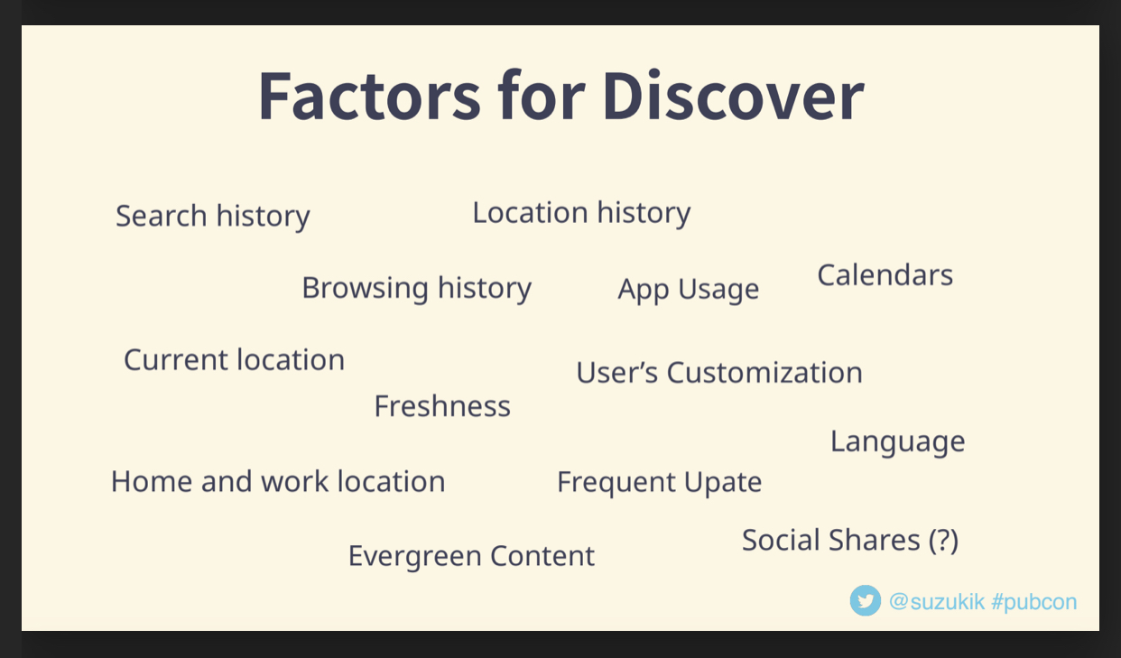 This screenshot from a presentation by Kenichi Suzuki highlights some of the factors that help pages appear in Discover.