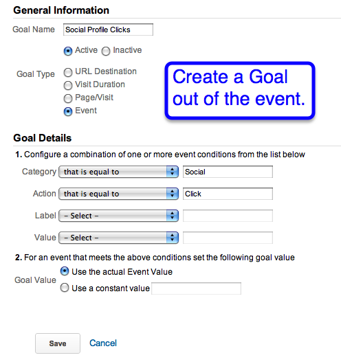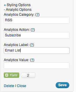 Events: Are there links on your site, which send a person somewhere externally, but fulfill a goal? Like an RSS button or a link to your Twitter Profile? You should track as many of those as you can with events.