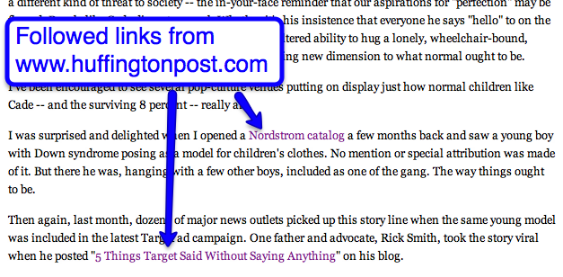 For example, look at the post he wrote about a Target advertisement which discretely uses a child with Down Syndrome. According to Open Site Explorer, it received 90 LRDs and 14,900 facebook shares. It got linked to by the Huffington Post, ABC News, and many more quality sites. Rick combined the topic of Down Syndrome, with the department store Target and its advertising message.