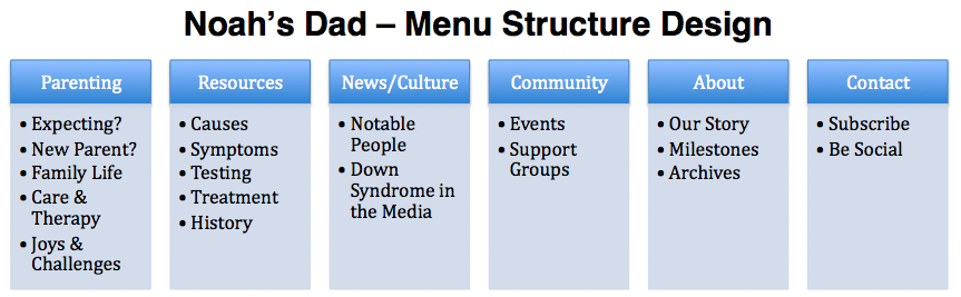 Tip: When structuring your content, don't reinvent the wheel! This resource about Down Syndrome was very useful when coming up with the menu.