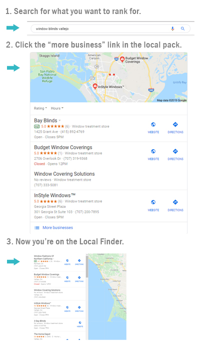 The Local Finder isn’t typically 100% identical to the local pack in exact ranking order, but it’s the best place I know of to see how things stand beyond the first 3 results that make up Google’s local packs, telling a business which companies they need to surpass to move up towards local pack inclusion.