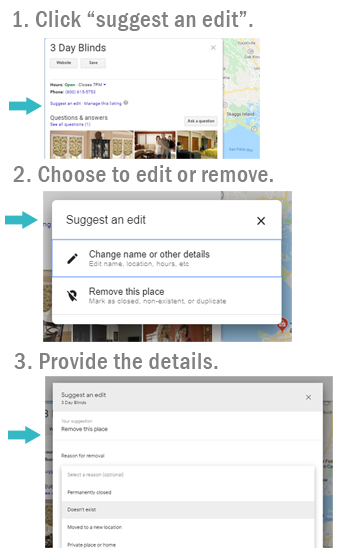 But, today, I promised the easiness of falling off a log, so our first effort at impacting the results will simply focus on the “suggest an edit” function you’ll see on each listing you’re trying to get rid of. This is how you do it:
