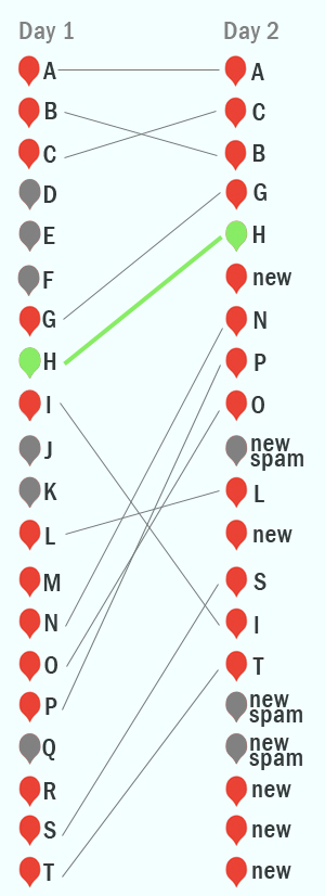 The red markers are legit businesses. The grey ones are spam. The green one is the Home Depot I was trying to positively impact. I attributed a letter of the alphabet to each listing, to better help me see how the order changed from day one to day two. The lines show the movement over the course of the 24 hours.