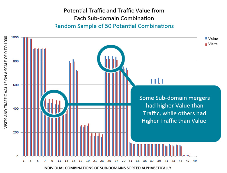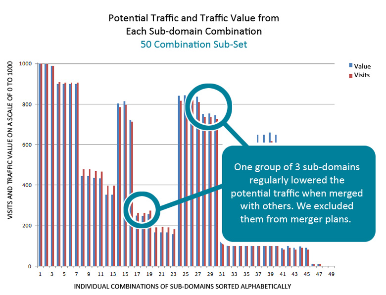 Finally, we were able to look closely at sub-domain merger combinations that offered more search value and less search traffic, or vice-versa. Ultimately, though, 3 options vied for the top spot. They were statistically indistinguishable from one another in terms of potential traffic and traffic value. This meant the client wasn't tied to a single potential solution, they could weigh other factors like the difficulty of merging some sub-domains and internal political concerns.
