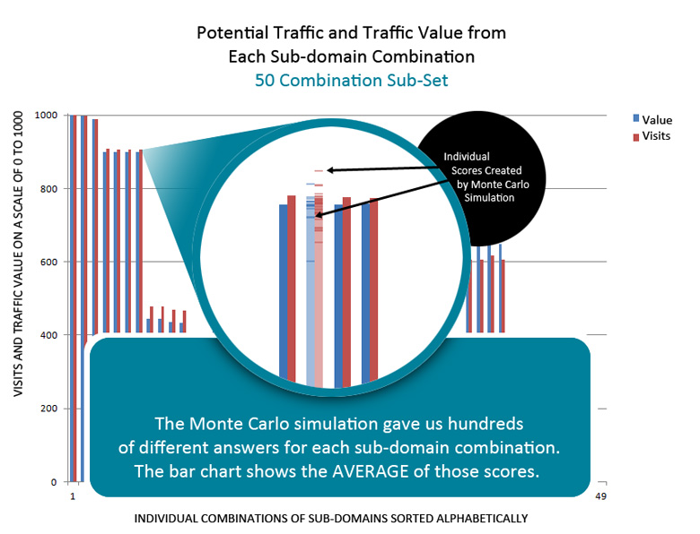 There were some neat trends that the Monte Carlo simulation revealed. Of the sub-domains tested, 3 in particular tended to have a negative rankings effect on nearly all of the combinations. Each time a good sub-domain was merged, these 3 would intermix with combinations to slightly lower the traffic volume and traffic values. It turned out these 3 sub-domains had very few backlinks and only brand keyword rankings. Subsequently, there was huge keyword overlaps and almost no net link benefit when merged. We were easily able to exclude these from the sub-domain merger plan. We would have never guessed this, or seen this trend, without this kind of mathematical modeling.