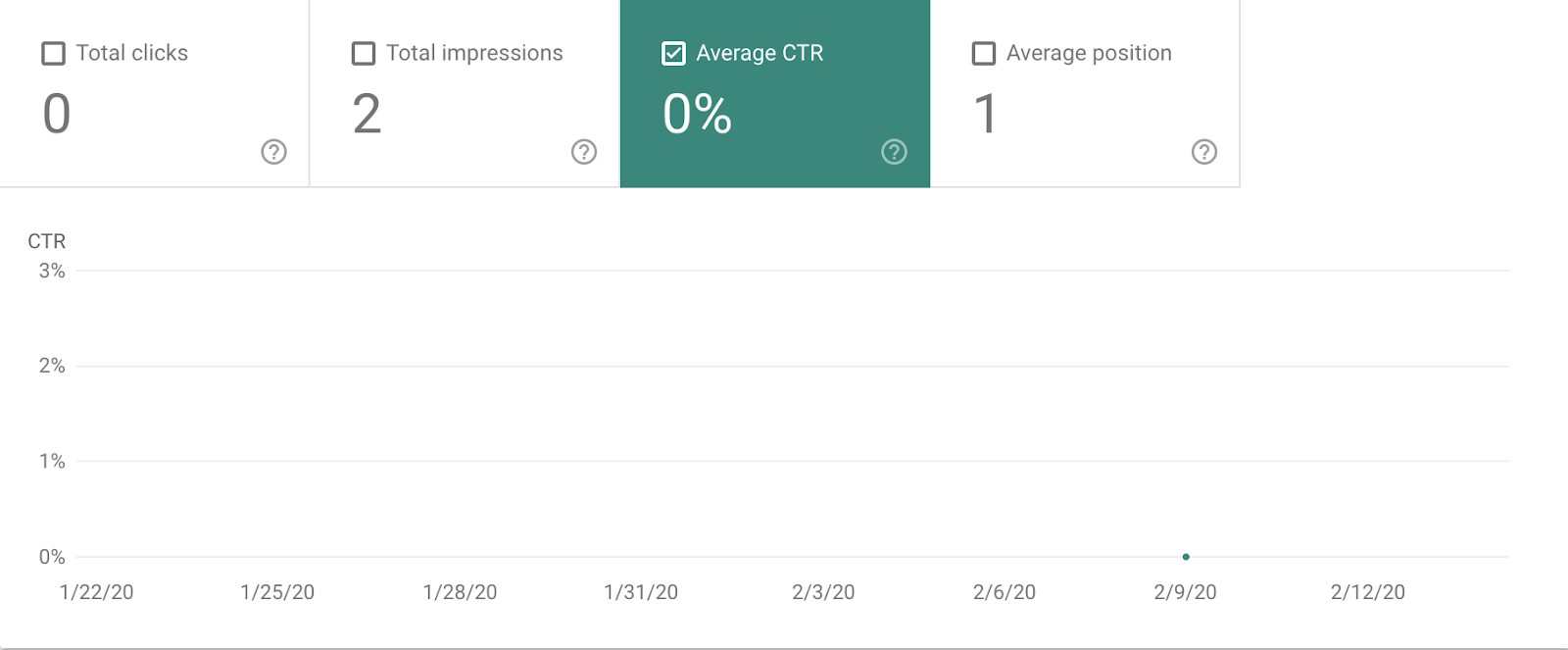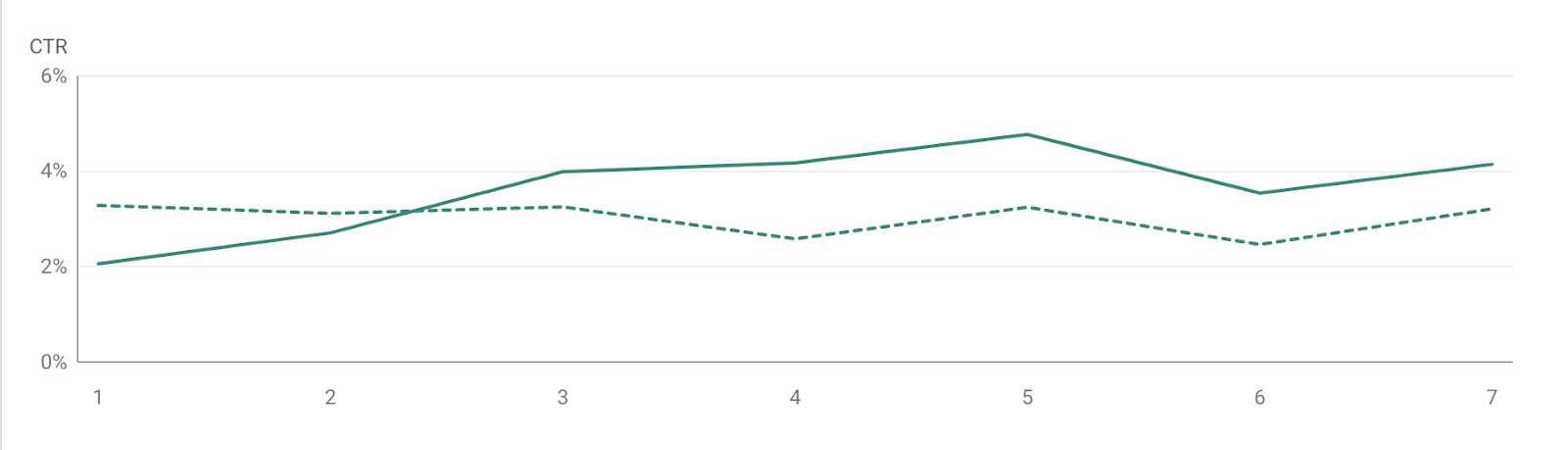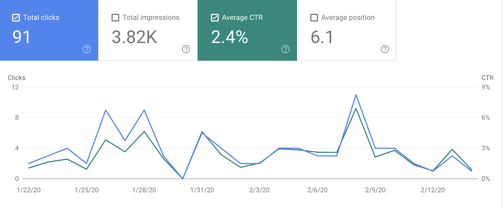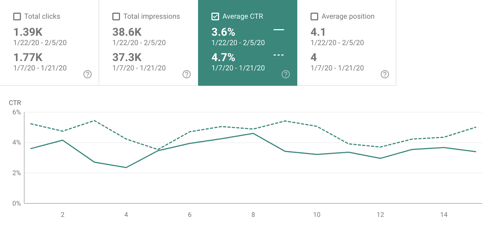 As you can see, the impressions and average position remained nearly identical for these two periods. But CTR and subsequent clicks decreased dramatically in the two weeks immediately following the January 22nd spot-zero termination.