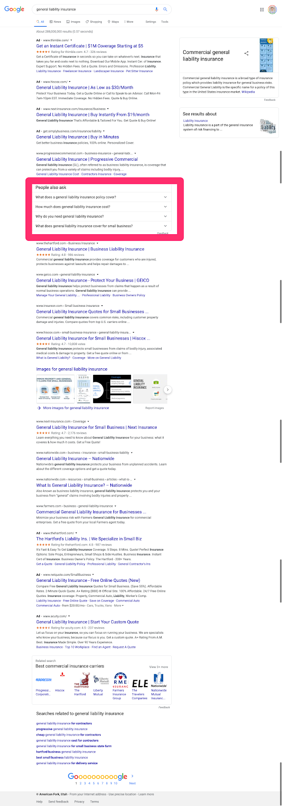 The negative effects of the PAA box appearing in your SERP are mitigated when the PAA box doesn’t serve immediately below the featured snippet. It’s rare, but there are situations where the “People Also Ask” box serves lower in the SERP, like this example below.