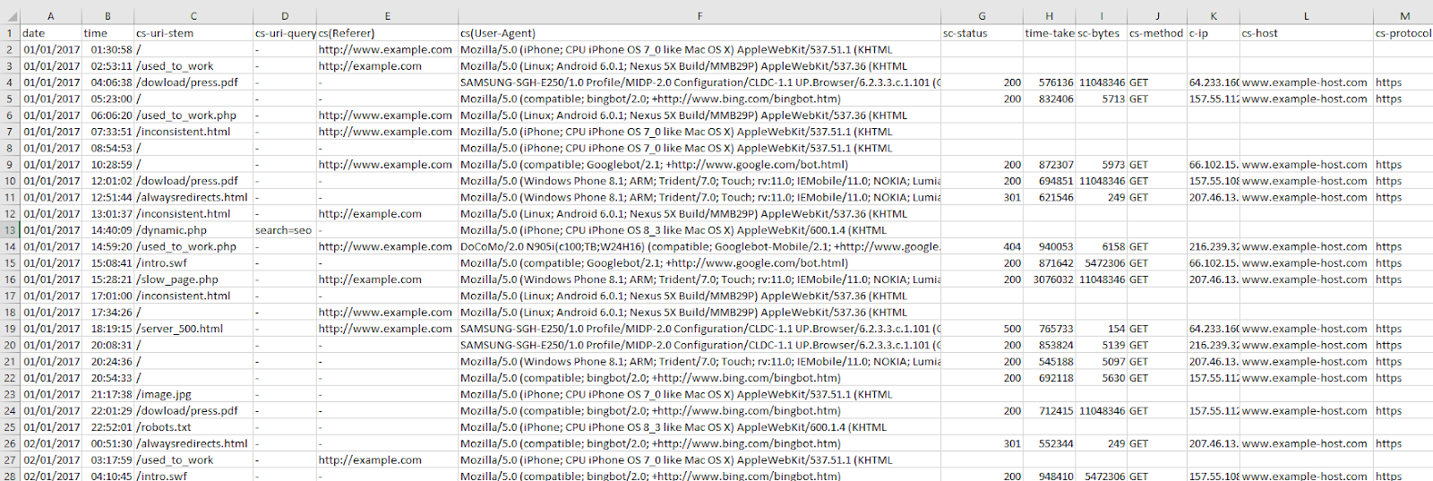 Now that your log files are ready for analysis, we can dive in and start to understand our data. There are many formats that log files can take with multiple different data points, but they generally include the following: