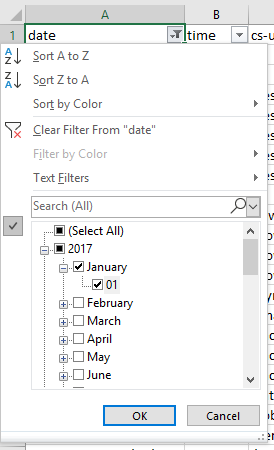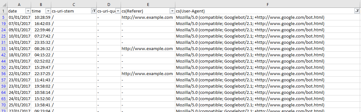 If you’re interested in seeing the behavior of a single user agent, this is easy as filtering out the relevant column in excel. In this case, with a WC3 format log file, I’m filtering the cs(User-Agent) column by Googlebot: