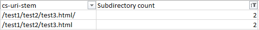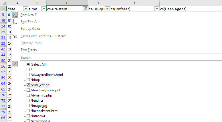 This is a fast way of seeing if there are any problem areas by URI stem for a singular user-agent. You can take this a step further by looking at the filtering options for the URI stem column, which in this case is cs-uri-stem: