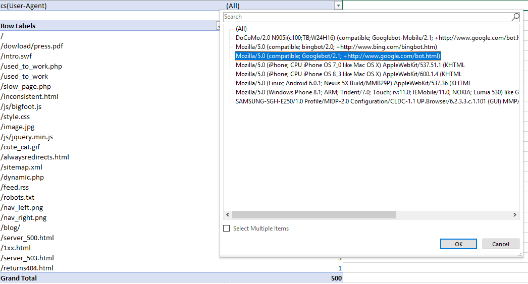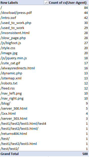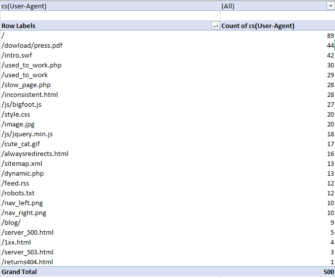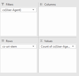 All we’re doing is filtering by User Agent, with the URL stems as rows, and then counting the number of times each User-agent occurs.