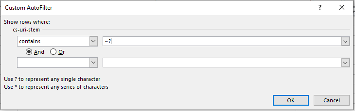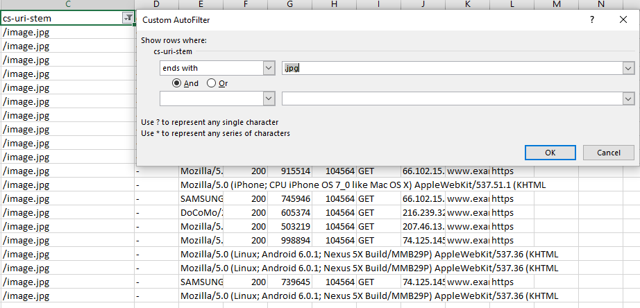 To do this, go back to your log file, and filter by URLs that contain a “?” or question mark symbols from the URL column (containing the URL stem). To do this in Excel, remember to use “~?” or tilde question mark, as shown below: