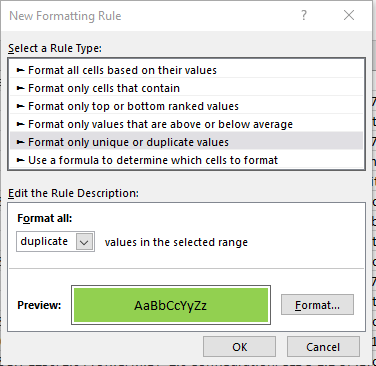 Then, use conditional formatting to identify duplicate values and highlight them.