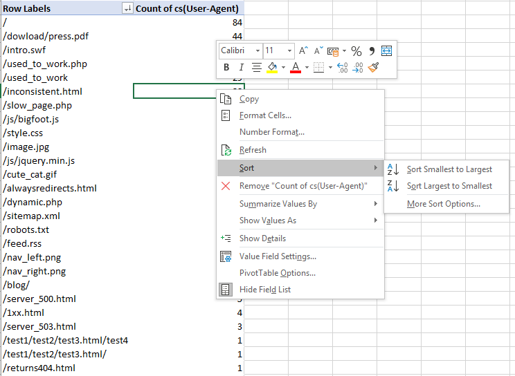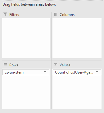 Once you have your pivot table created, set the rows to the URL or URI stem, and the summed value as the user-agent.