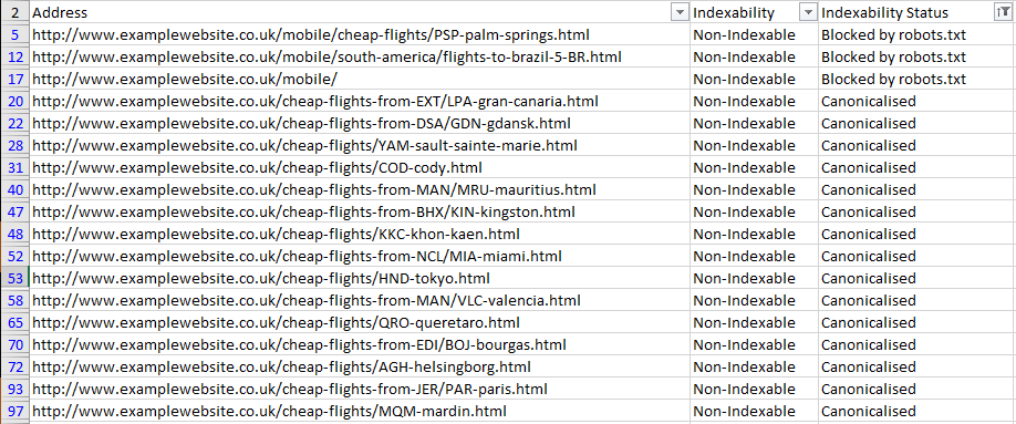 This will show you canonicalized, no-index by meta robots and canonicalized URLs. - Copy this new table out (with just the Address and Indexability Status columns) and paste it in another sheet of your log file analysis export.