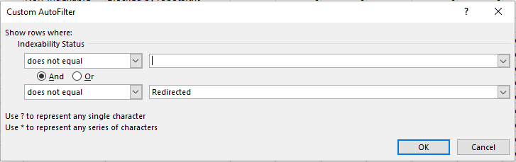 From there, you can filter the “Indexability Status” column and remove all blank cells. To do this, use the “does not contain” filter and just leave it blank. You can also add the “and” operator and filter out redirected URLs by making the filter value equal “does not contain → “Redirected” as shown below: