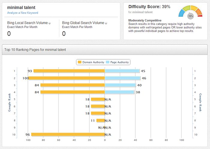 Just as a sanity check, I also fed the brand through Moz's Keyword Difficulty Tool, and got back the following (note: this is a paid tool, and I'm only showing partial data):