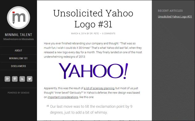 For a while, I've wanted to dig deeper into minimalist design, but design isn't something I have a lot of time for and I've worked with enough great designers to know that I'm not one. Finally it occurred to me – why not just embrace that and write a blog about being a lousy designer? I may not be a great designer, but I am good at making fun of myself.