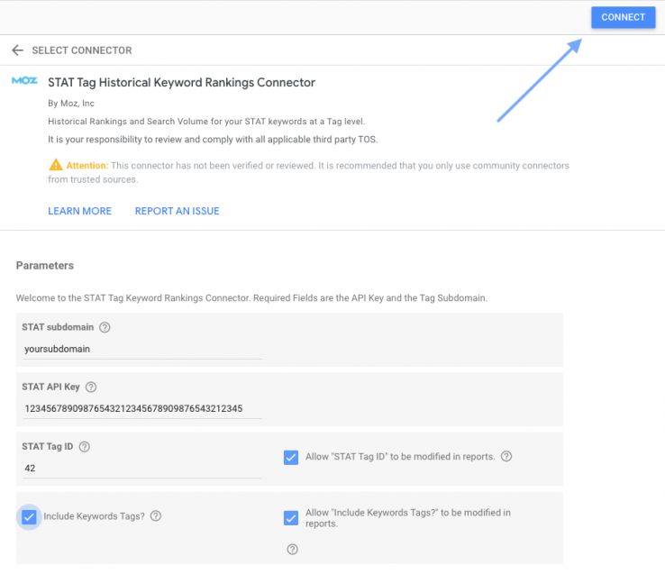 Thanks to the helpful feedback of many, many STAT customers, we’ve been hard at work building six Google Data Studio Community Connectors to help pull STAT data into Data Studio. Fortified by beta testing and your thoughtful input, we're excited to launch the six connectors today: Historical Keyword Rankings (site and tag level), Share of Voice (site and tag level), and Ranking Distributions (site and tag level).