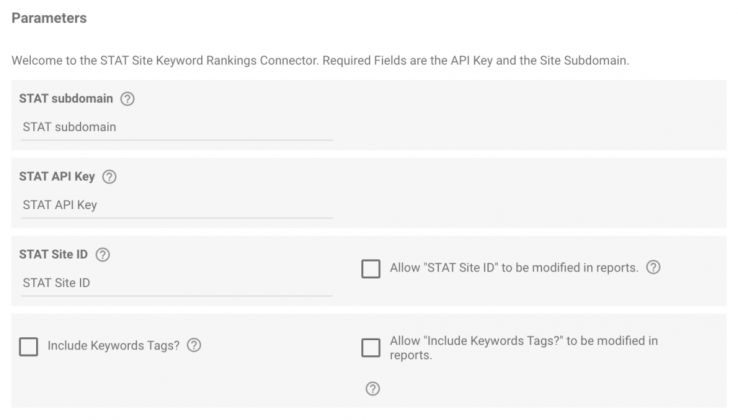 - Allow “Include Keyword Tags?” to be modified in reports: Tick this box to be able to turn the inclusion of the Keyword Tags column on or off from within the report, without reconfiguring the connector (only applicable to site and tag historical keyword rankings connectors).