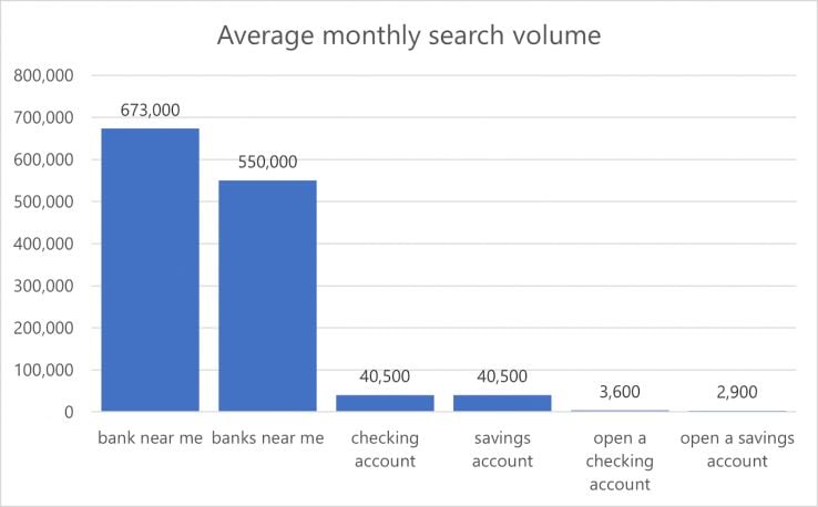 I chose “banks near me” and “banks in {city, st}” based on their strong local intent and high search volumes, compared to more specific keywords for banking services.