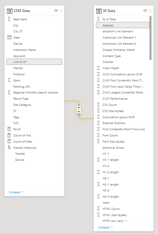 Once your data sets are loaded, it’s time to make the magic happen by creating relationships in your data to unlock correlations between rankings and site characteristics. To combine your data in Power BI, create a many-to-many relationship between your STAT Full URL and Screaming Frog Original URL fields.