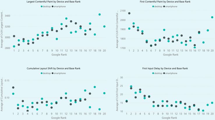 Some CWV elements correlate more closely with better rankings and others are more scattered. This isn’t to say CWV aren’t important or meaningful, but rather it’s a starting point for further analysis after May.