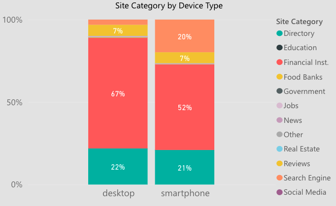 Okay, now let’s mash up our data sources to see how the distribution of website categories varies by rank on desktop devices. Suddenly, we can see that financial institutions actually occupy the majority of the top 3 results while reviews sites and directories are more prevalent in positions 4-10.