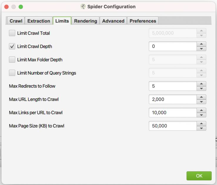 Limit Crawl Depth: Set this to 0 (zero) so the spider will only crawl the URLs on your list without following internal links to other pages on those domains.
