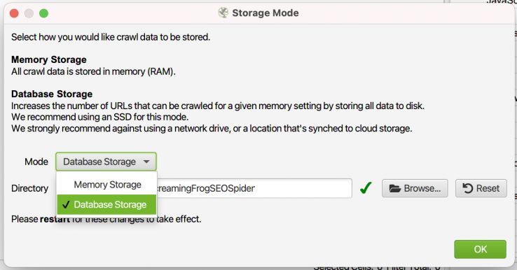 Database Storage Mode: It may be a bit slower than Memory (RAM) Storage, but saving your crawl results on your hard disk ensures you won’t lose your results if you make a mistake (like I have many times) and close your report before you finish analyzing the data.