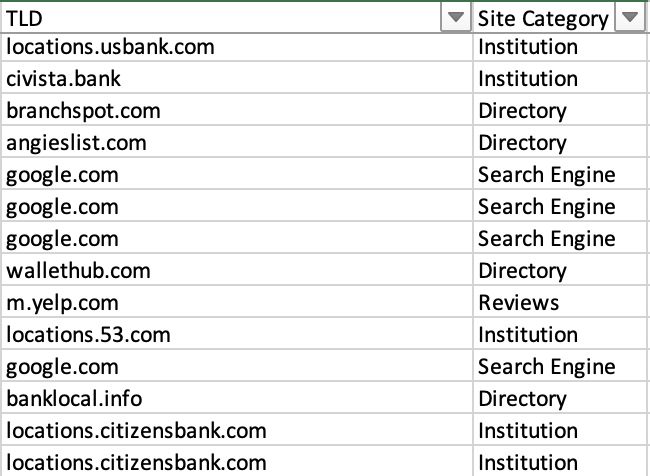 Skimming through the SERP results, it’s easy to see that banks are not the only type of website that rank for keywords with local search intent. Since one of my initial questions was SERP composition, I had to identify all of the different types of websites and label each one for further analysis.