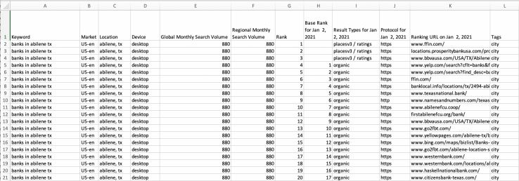 My 1,256 keywords generated over 25,000 rows of data per day. Each row is a different organic listing and includes the keyword, monthly search volume, rank (includes the local pack), base rank (does not include the local pack), https/http protocol of the ranking URL, the ranking URL, and your tags.