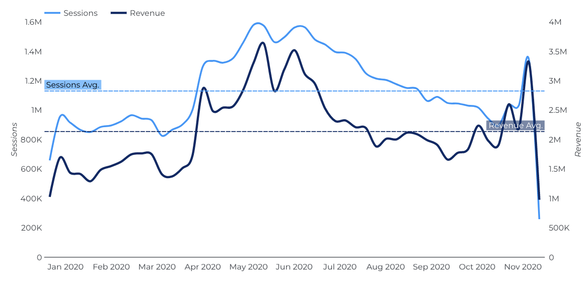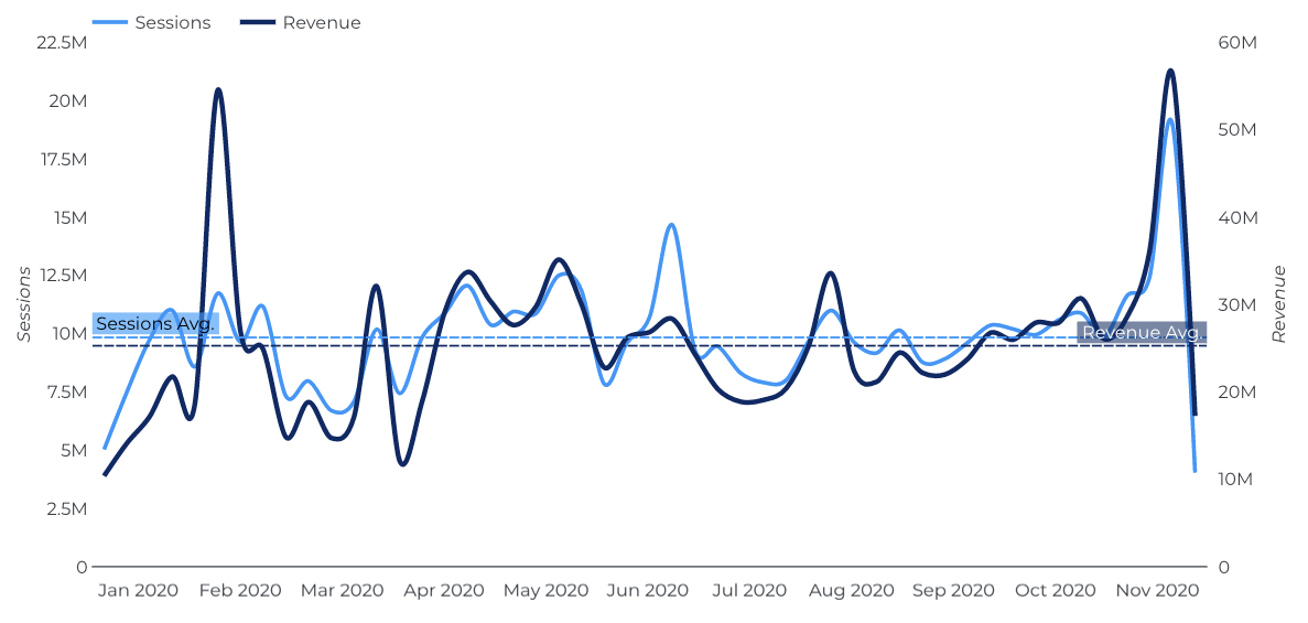 There was a noticeable jump in both sessions and revenue during the (1) week of April 13th, when $80M worth of stimulus payments were deposited for taxpayers who had direct deposits set up. By the (2) week of April 20th, additional rounds of deposits were made to those who manually set up direct deposits through the IRS. And by the (3) week of June 3rd, the IRS had delivered $270B in stimulus checks to Americans. At this point, revenue and sessions began to normalize below that period of stimulus distributions until the undeniable Black Friday sales occurred.