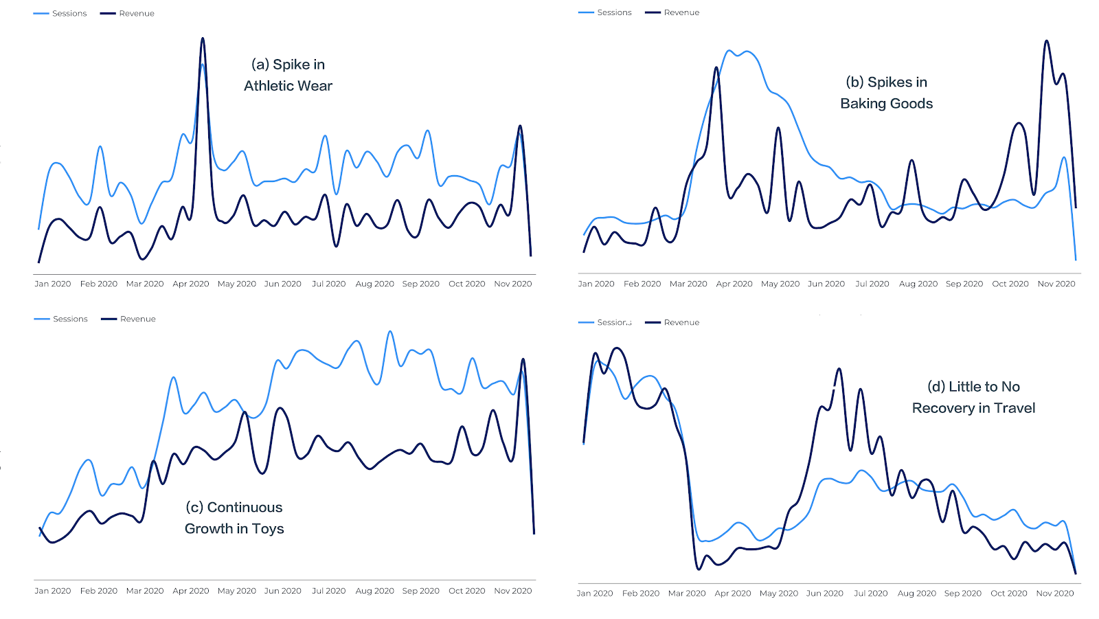 The analyses from S&P Global and the U.S. Census Bureau were accurately reflected in our study as well. Through the end of November, the average revenue for the Shopping sites in our analysis was 27.5% higher than our dip seen in March while sessions were 24.4% higher.