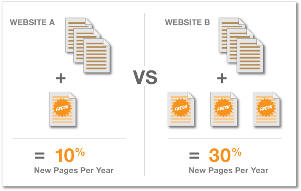 You're also creating new freshness. I did a blog post a few months ago about freshness factors. When you add new content to your website, you're giving Google all these freshness signals that say, "My site is still relevant. It still matters. Crawl me more, index more of my pages." And just by having that freshness, you'll see this line increase. That is a high ROI SEO activity. But also when you create new pages, you kind of get a double freshness benefit because you have the opportunity to link back to your old material, your old, stale, 10-page, 100-page website. By creating that new content and linking back to yourself, you're telling Google these pages are still relevant. Yes, they've been on my site for 5 or 10 years and nothing has happened to them, but they are still important. I want you to crawl them. I'm linking to them now. It's not as strong a signal as external links, but it still gives you that opportunity.