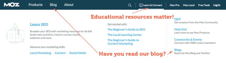You can see our desire to help people be better marketers and to connect with the community right up at the top of our site. Click on "Learn & Connect" to bring down a bucket of resources like our beginner's guides to SEO, Content Marketing, and Social Media, as well as our webinars, blog, and Q&A.