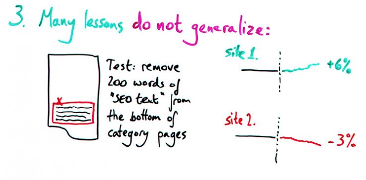 So surprising result number three is: How many lessons do not generalize? We've seen this broadly across different sections on the same website, even different industries. Some of this is about the competitive dynamics of the industry.