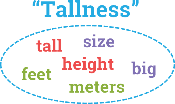 "Tall" and "height" are fairly synonymous, words like "size" and "big" are highly related, and units like "feet" and "meters" round out this concept. In theory, this makes perfect sense.
