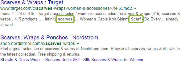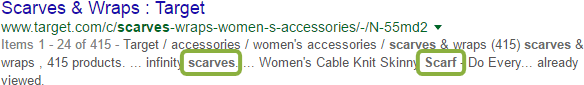 While we all know the dangers of keyword stuffing, it originated out of a certain necessity. Search engines simply weren't capable of equating even simple terms, like plurals. Those days are long behind us. Google understands, for example, that a search for "scarf" should also return results for "scarves":
