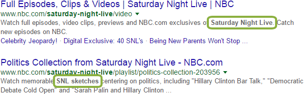 How about acronyms? Here's a search for "SNL skits":
