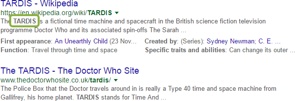 Here, Google is happy to tell us "Hey, nerd, just say 'TARDIS' like everyone else." The six-letter acronym is interchangeable with even the much longer search string.
