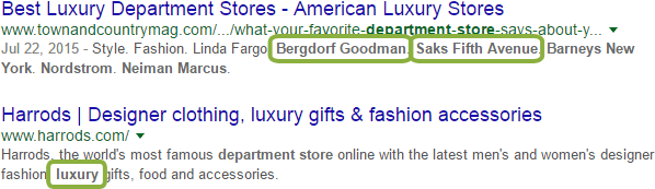 Wait, it gets worse. Google can go beyond traditional synonyms. Consider this search for "upscale department stores" (run from my home-base in the Chicago suburbs):