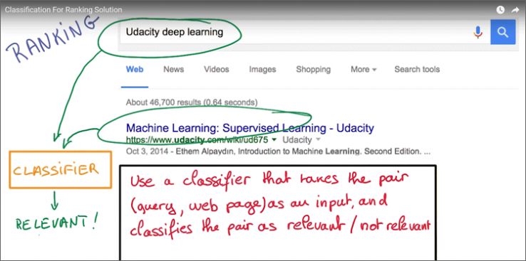 Two things are worth noting in this deceptively simple screenshot. First, ML is being used as a relevance engine. I think it's safe to say that the quiz is not entirely hypothetical. Second, notice the query and the matching page. The query is "Udacity deep learning", but the matching result title contains the related phrases "machine learning" and "supervised learning." This is starting to look like some of the examples we saw earlier.