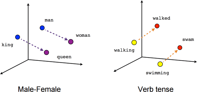 Here, Word2Vec has learned that the relationship between man and woman is the same as the relationship between king and queen (encoded in the direction of the vector). Similarly, the relationship between the verb tense walking to walked is the same as the relationship between swimming and swam. More importantly, these rules didn't need to be specified. The machine learned them by studying large collections of real words in context.