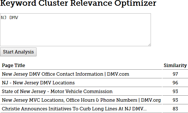 This screenshot has been edited, but the data is real. What the tool is saying is that a page with the title "State of New Jersey - Motor Vehicle Commission" is a good match (93%, although the system is a little forgiving) for "NJ DMV." The fact that we can train an ML system to perform this task doesn't prove RankBrain does it, but it does at least show that it is well within Google's ML capabilities.