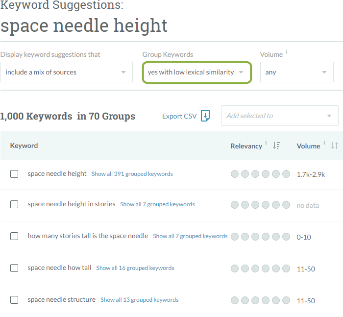 The system has tried to bucket the keywords into broader, more useful groups, allowing us to ignore some of the minor variants. So, let's pick three groups from this list: