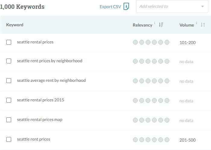 Let's work through another example, but one with commercial intent. Pretend you're working in the Seattle apartment space and are looking to write an article about rental costs. Just to pick a starting point, you enter "Seattle rental prices" into your keyword research tool of choice and gather your keyword list: