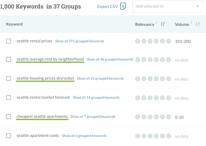 For the final group ("Seattle average rent by neighborhood"), I browsed the grouped keywords, and one caught my eye: "average rent downtown seattle." I like this one because it's specific to an actual neighborhood, although we might choose to craft content around some kind of neighborhood-by-neighborhood theme as well. What I like about trying to understand our keywords as groups/clusters is that it's also a great process for generating content ideas.