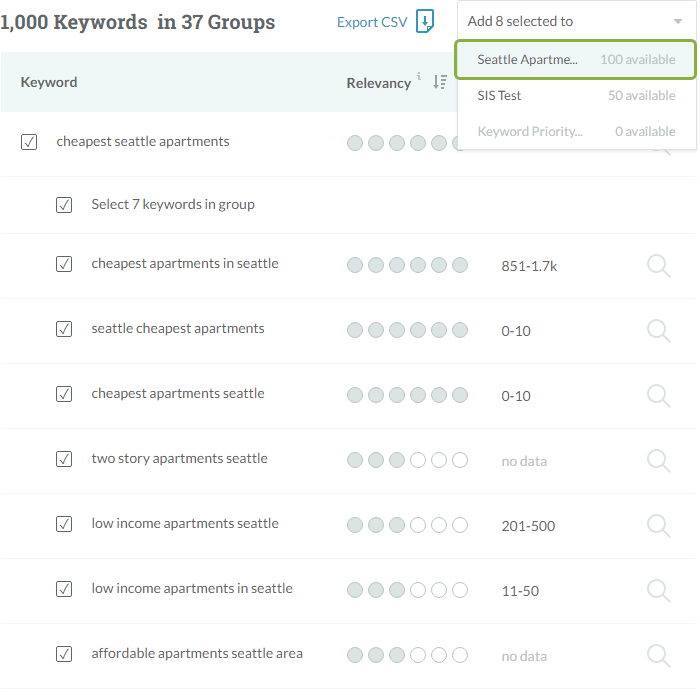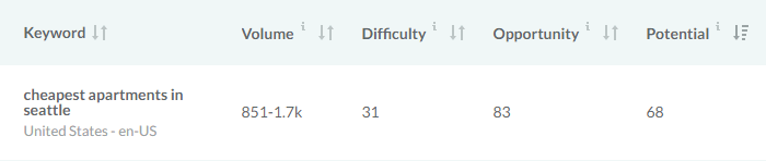 Once the stats for the list are collected, we can take a look and see that "cheapest apartments in Seattle" has both the highest traffic volume and Keyword Potential, according to our metrics: